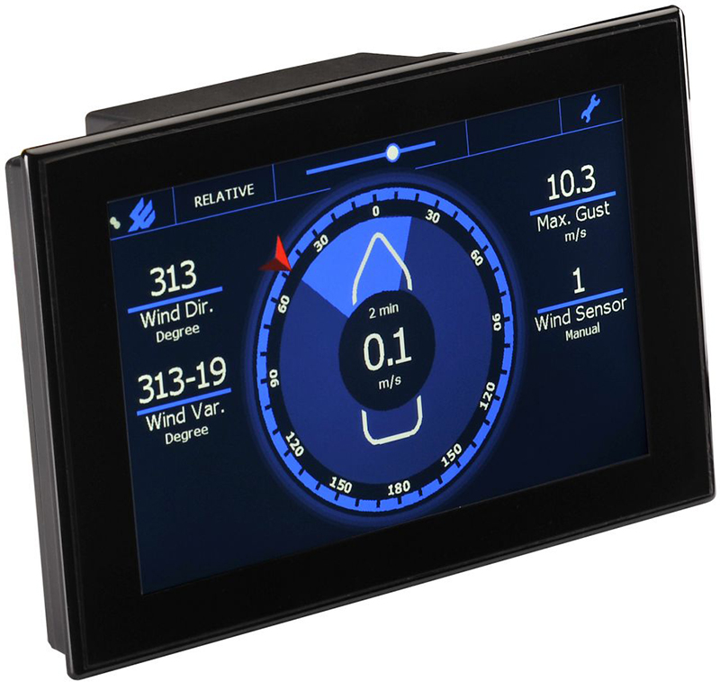 多功能 TFT 風(fēng)顯示器可以在氣象(N-E-S-W) 或海洋(左舷/右舷)模式下顯示風(fēng)速和風(fēng)向。 風(fēng)信息顯示采用8.5英寸LED背光,工業(yè)級(jí)液晶屏,以170°真視角顯示數(shù)據(jù)。