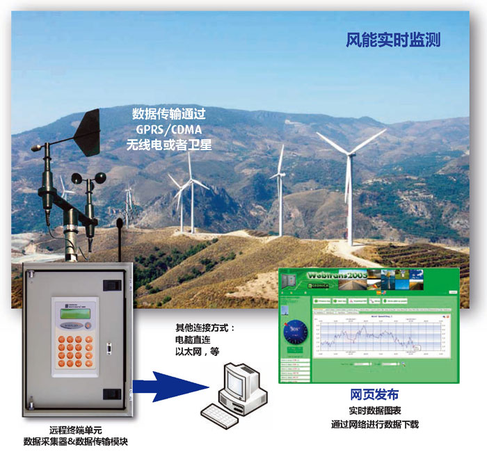 WindPower風能監(jiān)測系統(tǒng)的基礎(chǔ)是METEODATA-2000/3000C數(shù)據(jù)采集中心單元,其兼具數(shù)據(jù)采集器、PLC和RTU的功能,并與專業(yè)軟件進行配套使用。這款高級的風能監(jiān)測系統(tǒng)可幫助您選擇合適的風力發(fā)電機組的安裝地點,同時也進行一些其他的測量,來進行遠程控制,或者生成可自定義的警報設(shè)置。遠程監(jiān)測數(shù)據(jù)可通過GPRS/CDMA蜂窩網(wǎng)絡(luò)、無線電、衛(wèi)星、以太網(wǎng)等方式進行傳輸,也可以通過WEBTRANS平臺以網(wǎng)頁的方式進行傳輸。詳細的數(shù)據(jù)傳輸方案請與我們聯(lián)系。